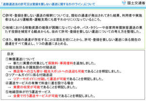 - 「道路運送法の許可又は登録を要しない運送に関するガイドライン」の公開について国土交通省が、許可・登録を要しない運送の解釈について、類似の通達が発出されてきた結果、利用者や実施者… 続きを読む: 「道路運送法の許可又は登録を要しない運送に関するガイドライン」の公開について